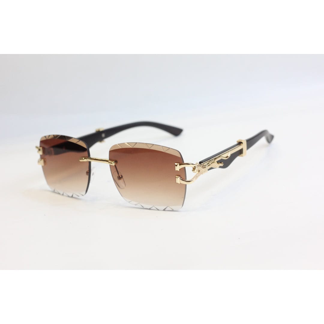 Jagwaur polarized Sun glasses with gold frames and black lenses on a light gray background